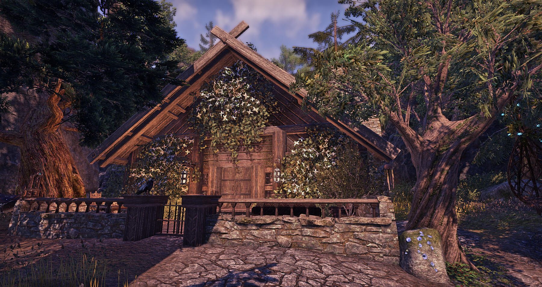 The Svarvad Barrow is the remains of an ancient burial site located deep in the Jerall Mountains of Skyrim. It is rumored to be the burial chamber of a dragon priest and is considered haunted.However, the barrow holds a secret behind its locked doors. If one is able to unlock the final door, they will be treated to the peaceful, hidden valley beyond and find the quaint cottage of Caspian Thateus nestled in the valley's woods.The cottage boasts an alchemy garden, a wood carving shop, and an alchemist workshop.